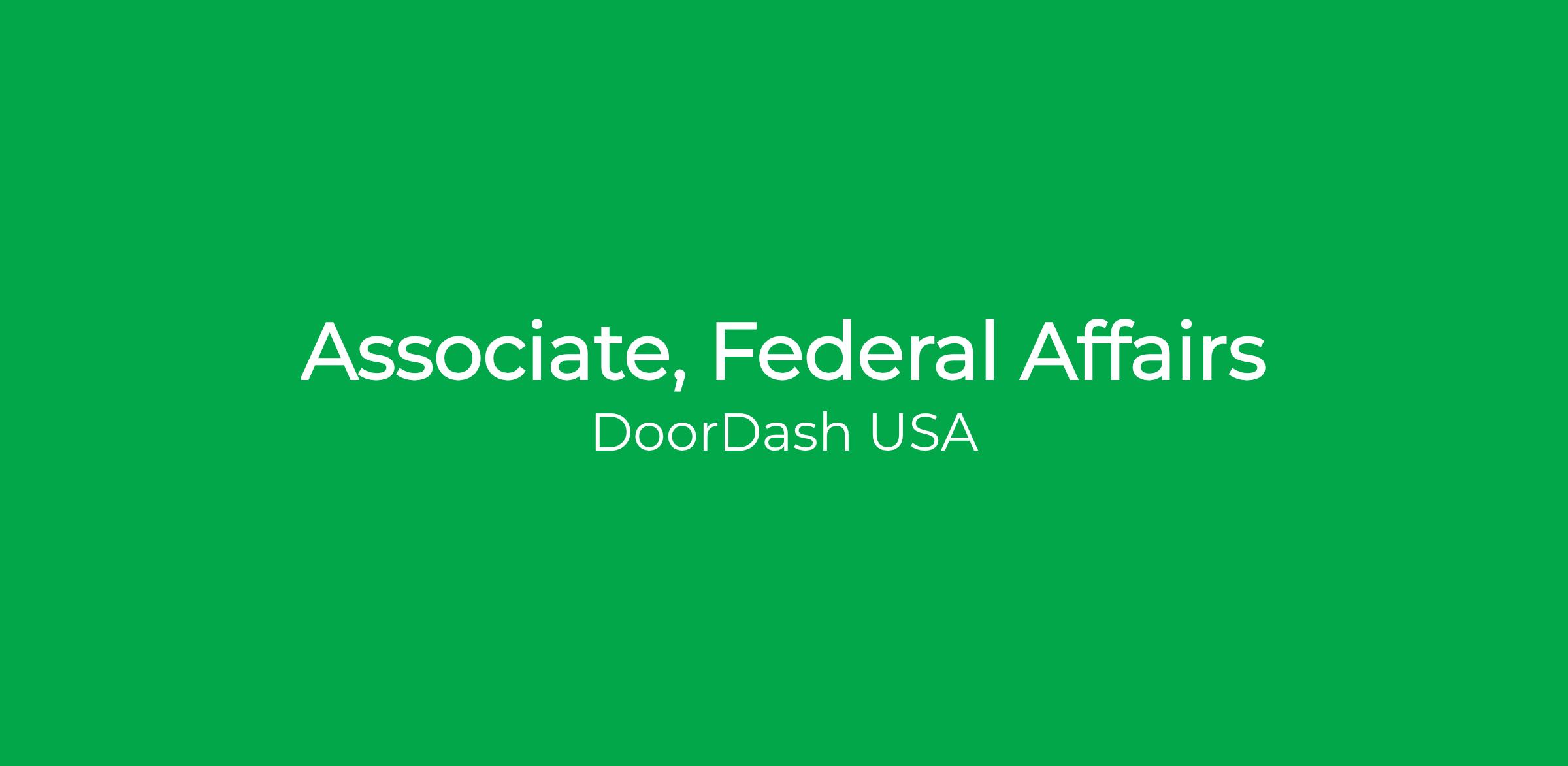 DoorDash is hiring a proven Federal Affairs Associate to help shape our public policy strategy and execution, independently assist with integrated issue management campaigns, and build lasting and positive relationships with federal public policy stakeholders. Based in Washington DC, you’ll be a key team member supporting the work of the Federal Affairs team and work closely with Public Affairs, Communications, Legal, and other business functions. You will report to the Head of Federal Affairs.