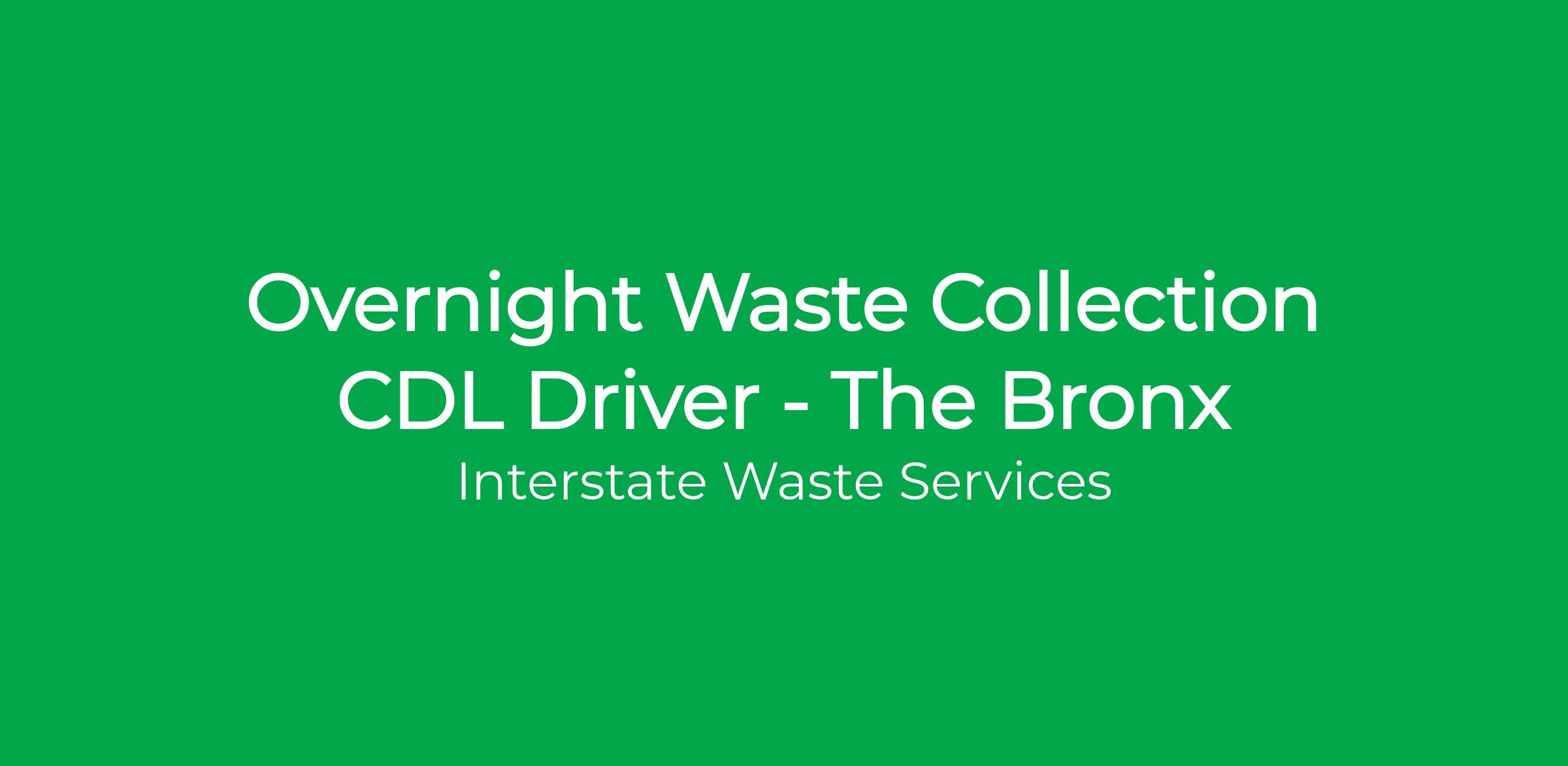 We are seeking a Waste Collection CDL Driver who will be working out of our Bronx Depot (315 Casanova St, Bronx, NY 10474) and reporting to the Site Manager but is also subject to supervision by Route Supervisors and Dispatchers. This is a full time, Union, non-exempt, hourly position with an overnight schedule starting anywhere between 6pm and 10pm, Sunday evening through Friday evening but may vary depending on business needs. Shifts may vary from 10 to 12 hours per evening or until the route is complete.