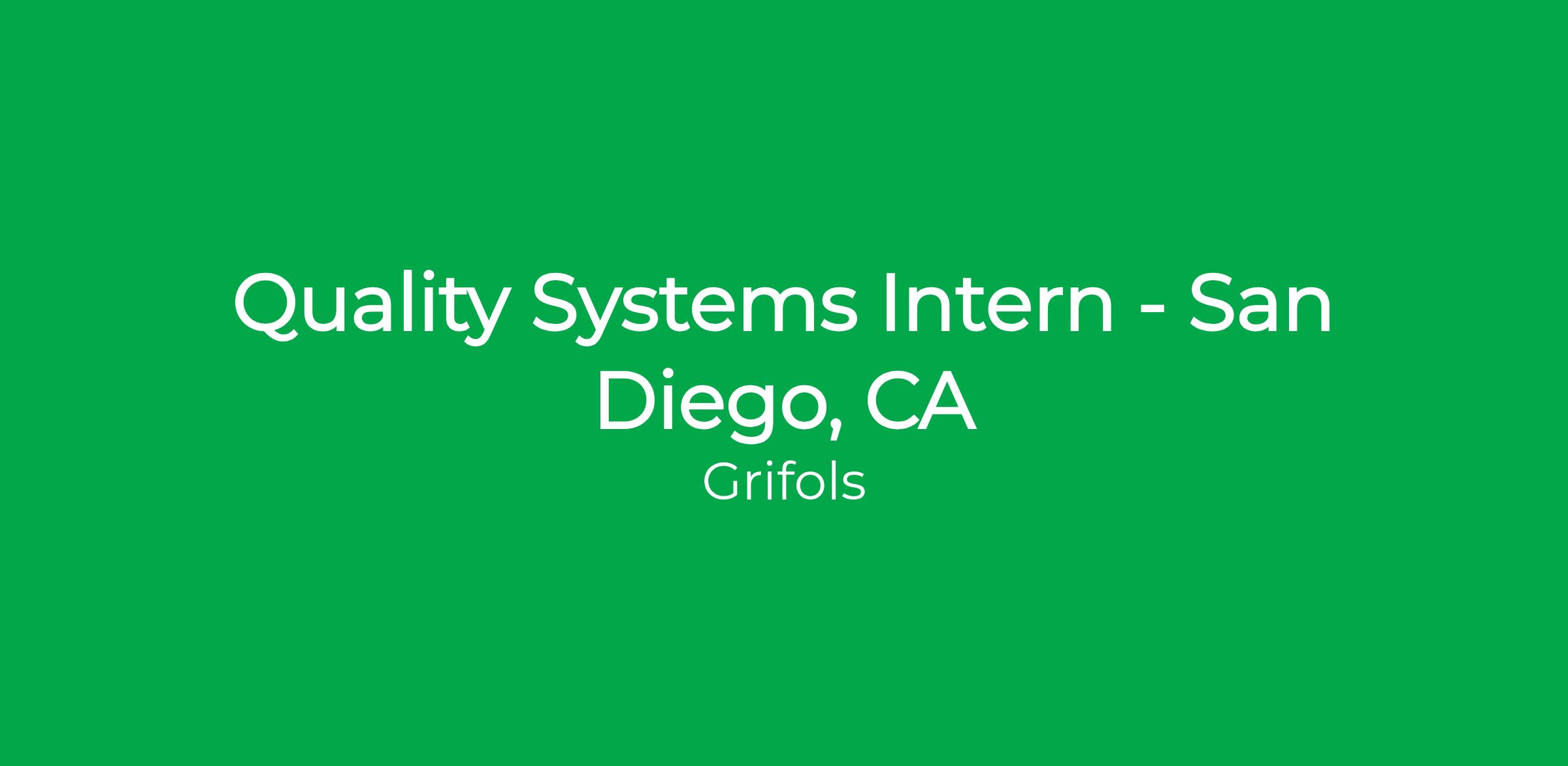 Grifols Diagnostic Solutions in San Diego is seeking a Quality Systems Intern for the summer. The Quality Systems Intern will work with various groups within the Quality department to gain an understanding of compliance, complaints, internal audits, non-conformances, quality events, corrective and preventive actions, design change controls, quality control procedures, record reviews, and new product development review of protocols, reports and risk.