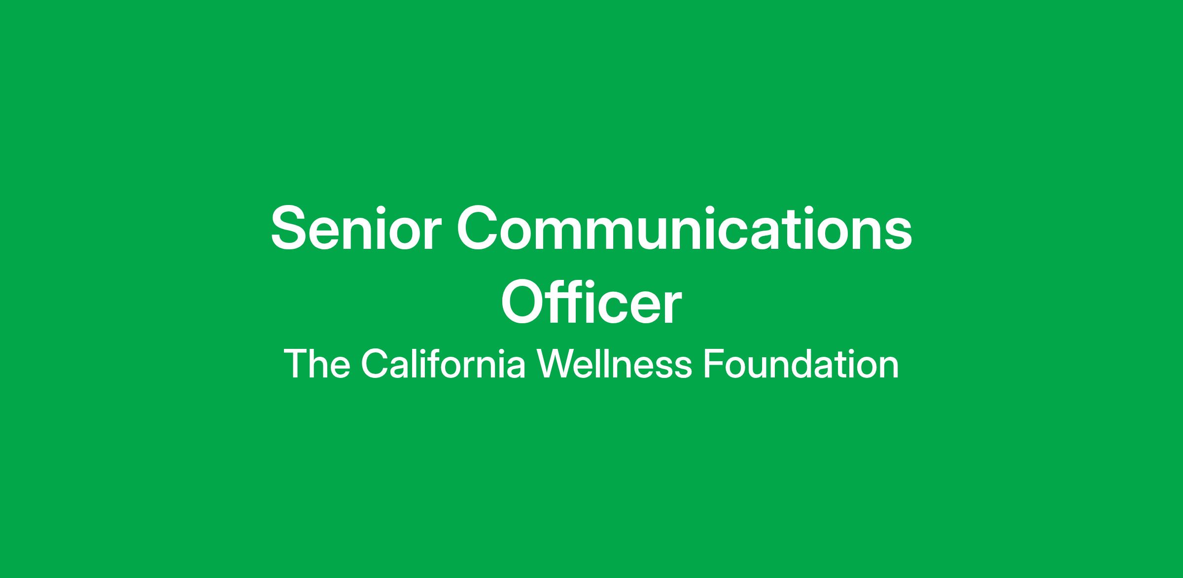 The California Wellness Foundation (Cal Wellness) seeks a skillful, creative, and strategic communications professional to serve as a Senior Communications Officer focused on proactively elevating the voice of the Foundation and its partners to expand visibility, influence, engagement, and impact. This role requires the skills and experience to develop, execute, and manage strategic communications across a full range of tools and tactics that advance the mission of the Foundation. The Senior Communications Officer will report directly to the Director of Communications and serve on the strategic communications team. They will be part of the Programs & Public Affairs Department, which integrates communications, government relations, community engagement, and grantmaking. The ideal Senior Communications Officer will bring a breadth of relevant experience and skills inclusive of writing, digital and social media, and storytelling through photos and videos; deep commitment to the mission; and a spirit of inquiry and positivity which allows them to contribute and thrive through moments of growth and transition.