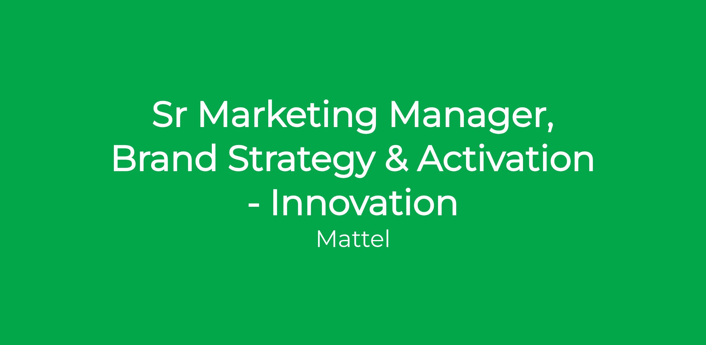 Mattel’s Innovation Venture team is responsible for launching breakthrough ideas – new brands, new business models and new ways to play. The Senior Manager, Brand Strategy & Activation – Innovation will lead the brand strategy, positioning and go-to-market strategy for 4+ new brands within the portfolio. The Sr Manager will manage a team of direct reports, and will report directly into the Sr. Director, Head of Brand Marketing – Mattel Masterbrand & Innovation.