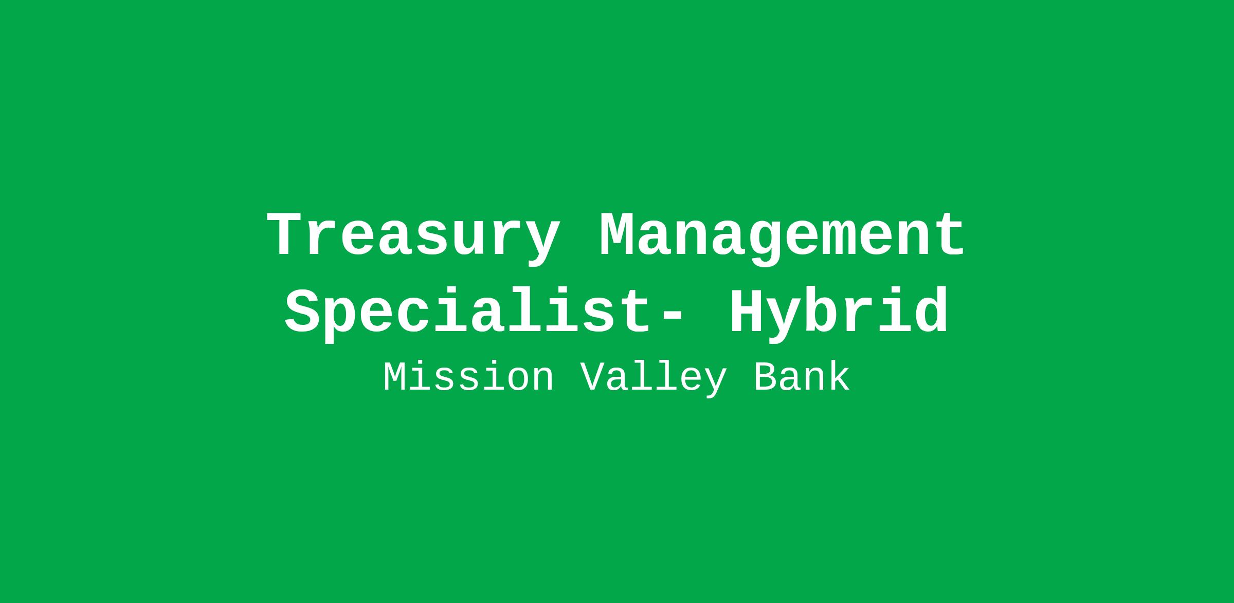 Are you seeking a fun, collaborative and dynamic environment where your contributions as a Treasury Management Specialist will be recognized? If the answer is yes, apply to become a member of Mission Valley Bank's valued, talented and proven team, dedicated to service excellence.