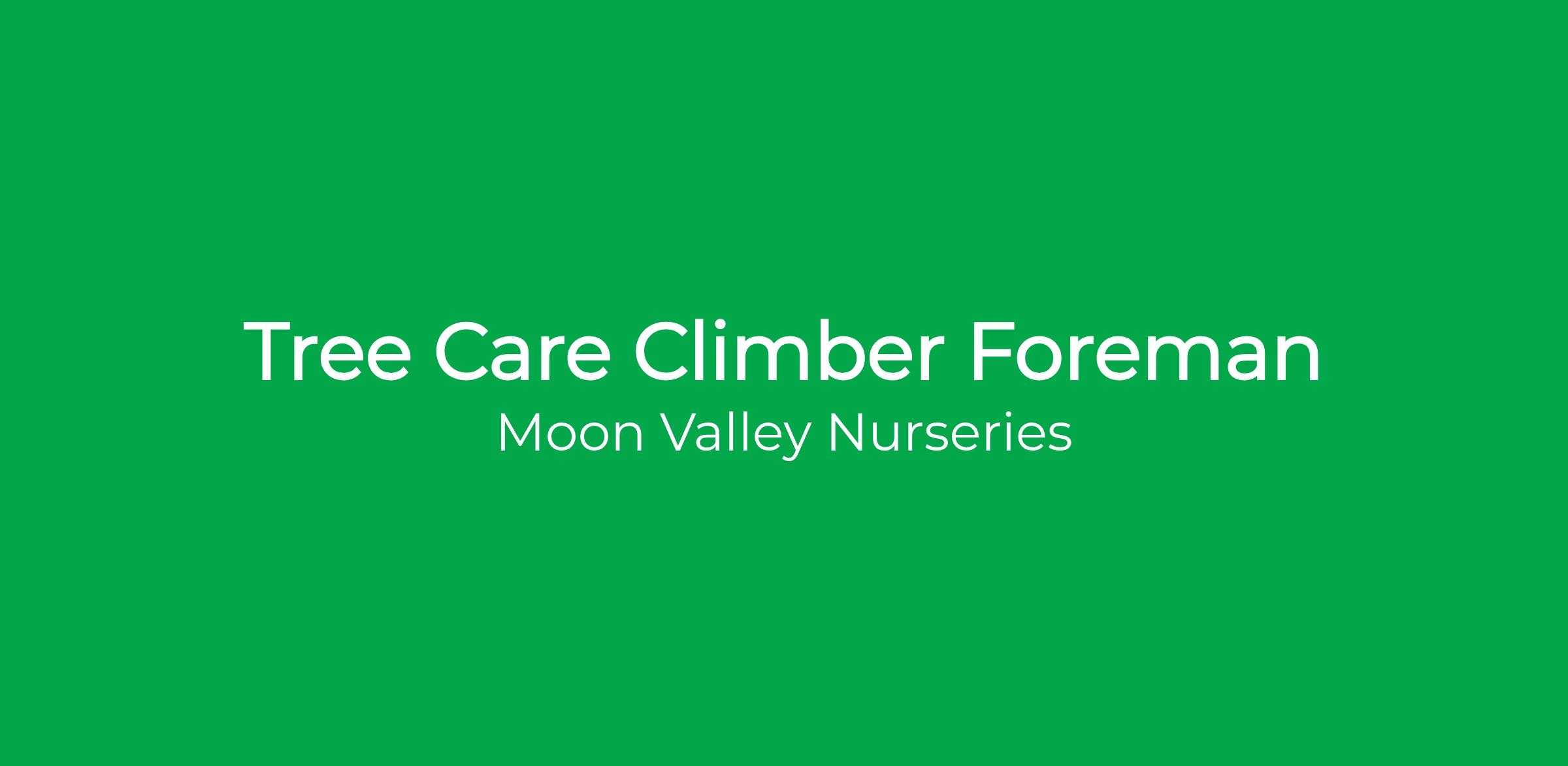 Moon Valley Nurseries is looking for a Tree Climber Foreman who will be responsible for providing expert tree surgery services and inspections to customer properties. This position requires driving and managing a team of tree workers at job sites in the performance of various tree trimming and care services. Responsibilities will include teaching, coaching, and performing climbing, pruning and tree removal services with bucket trucks, chainsaws, and other power equipment on residential and commercial properties.